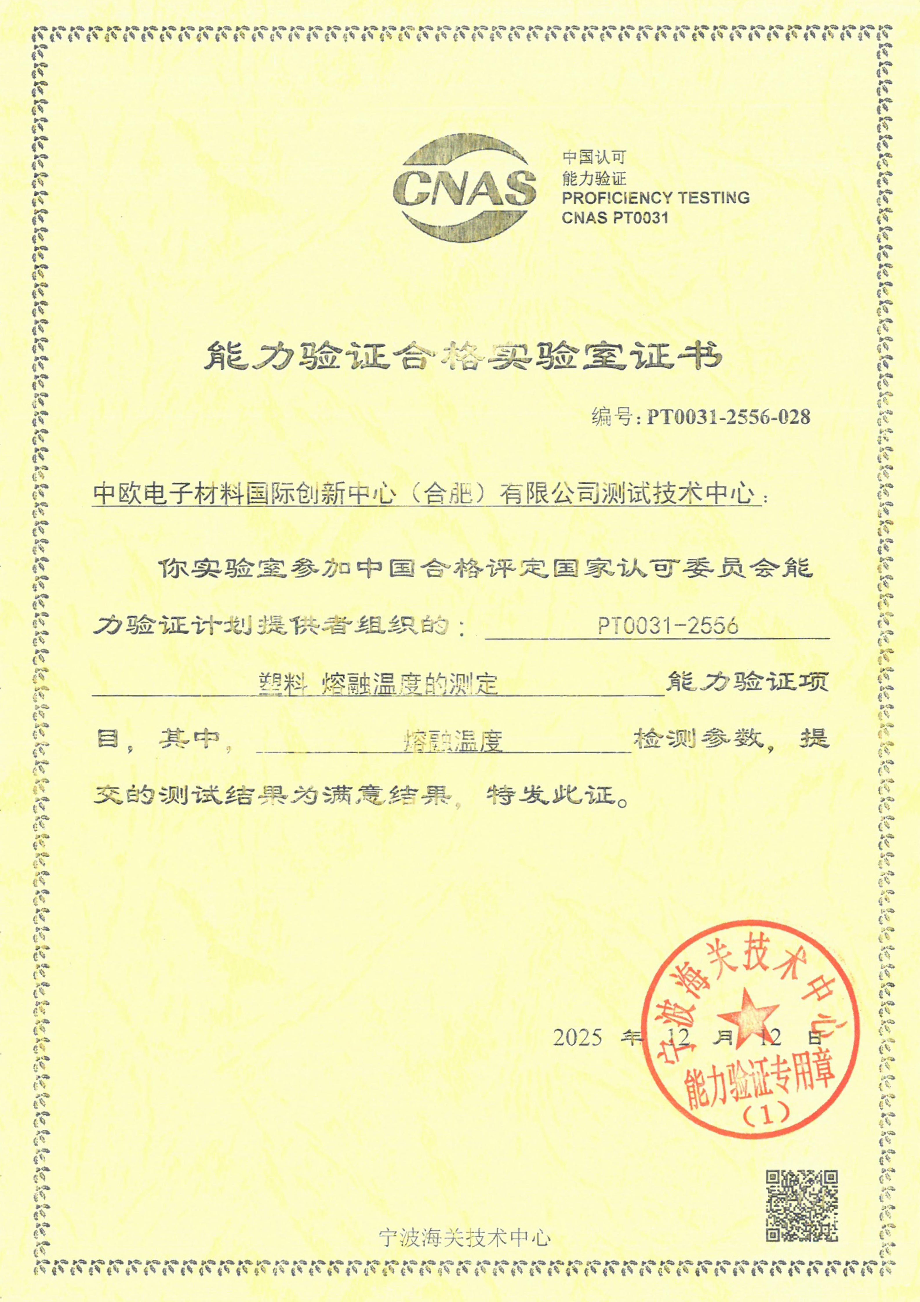 近日,中欧电子材料国际创新中心测试技术中心实验室参加了CNAS PT 0031-2556 能力验证,顺利通过塑料熔融温度的测定,取得满意结果(z值为-0.30),通过能力验证,并获得CNAS能力验证合格实验室证书。